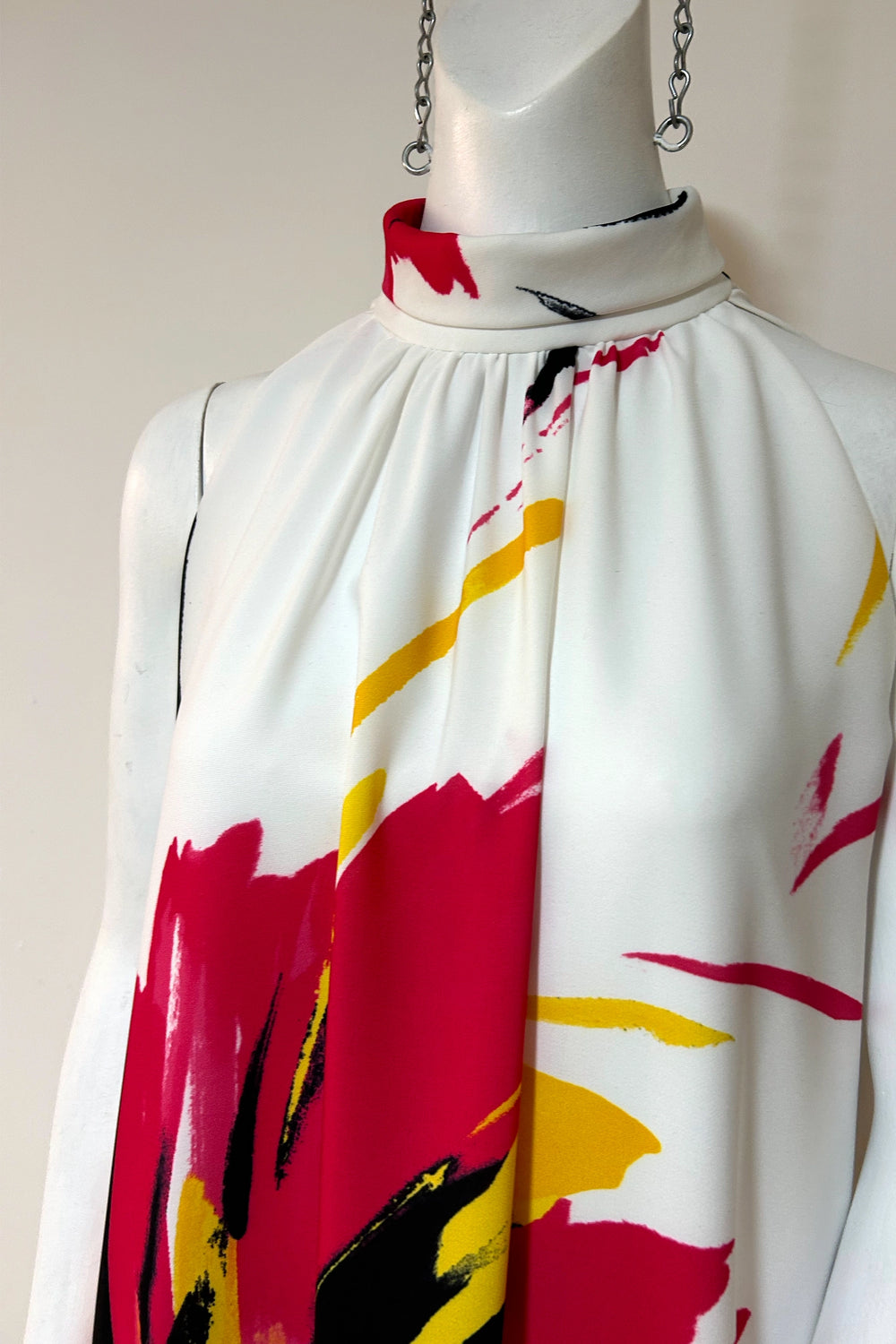The ultimate midi length Tent Dress. This dress is a statement piece featuring an oversized artistic brush painted floral print that is sure to turn heads. The dress features a soft, roll neck collar, double button closure and keyhole at the back neck and has a billowing, luxurious shape that flows beautifully. It is lined and also comes with pockets for added convenience.